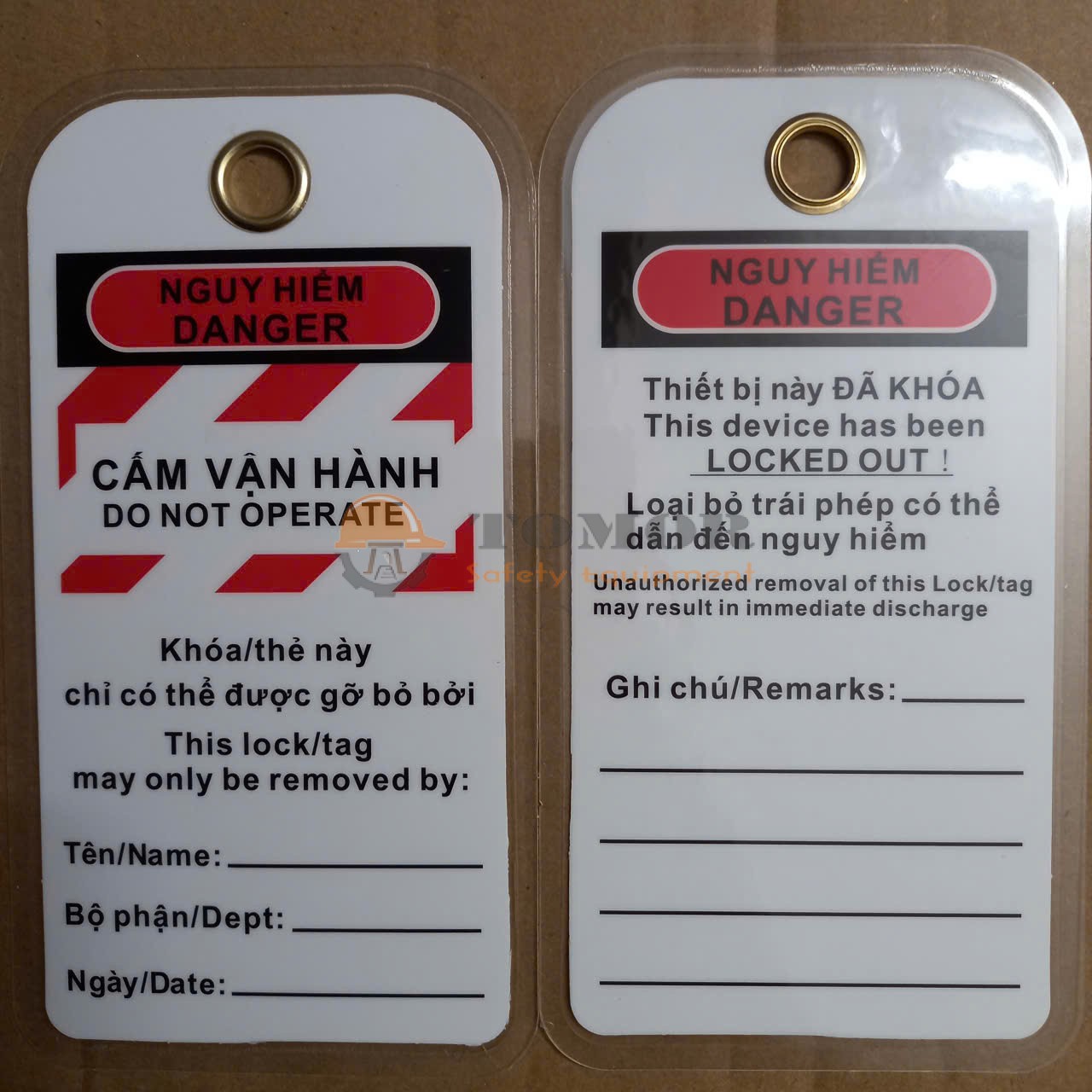 - 12 Thẻ cảnh báo BD-P02: Chất liệu nhựa ép plastic 2 mặt bền trong môi trường công nghiệp, lỗ khóa 10mm chắc chắn. Kích thước tổng thể 80mmx150mm- Tùy chọn ngôn ngữ: Việt, Anh, hoặc song ngữ Việt-Anh.